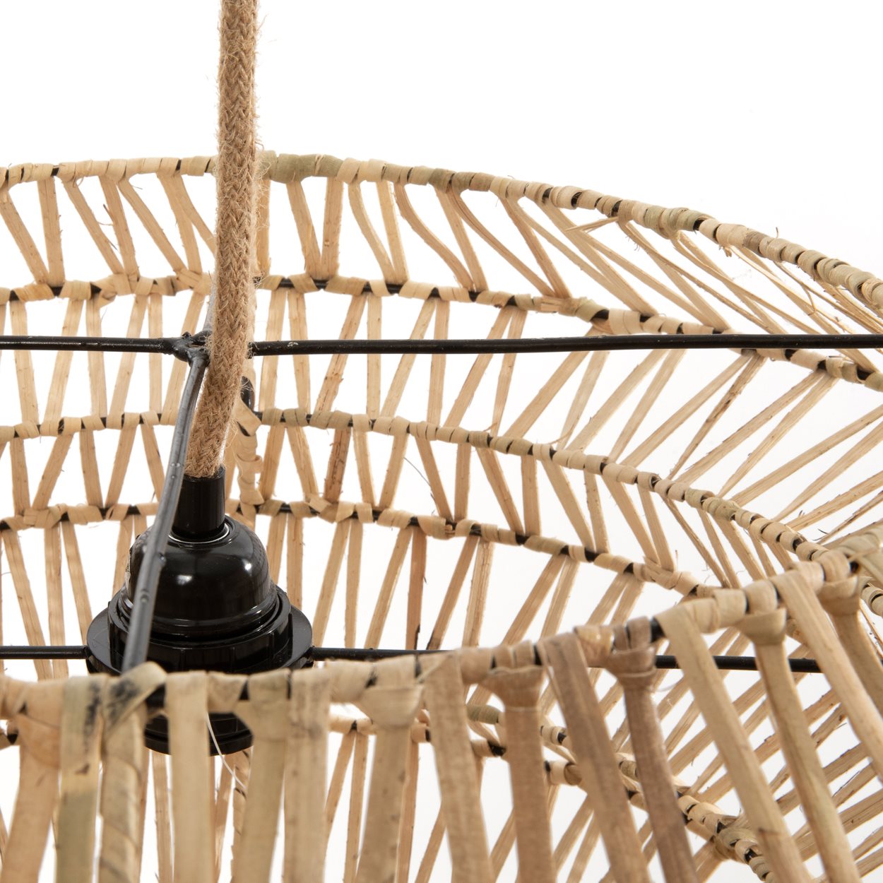 Verveeld met cirkels, rechthoeken en vierkanten? Waarom probeert u niet de ingenieuze vorm van deze rotan hanglamp! Deze oosters aandoende lampenkap, die van boven naar beneden iets taps toeloopt, zal stijl toevoegen aan (bijvoorbeeld) uw woonkamer. Ga voor bohemien, niet voor saai! Exclusief bekabeling.